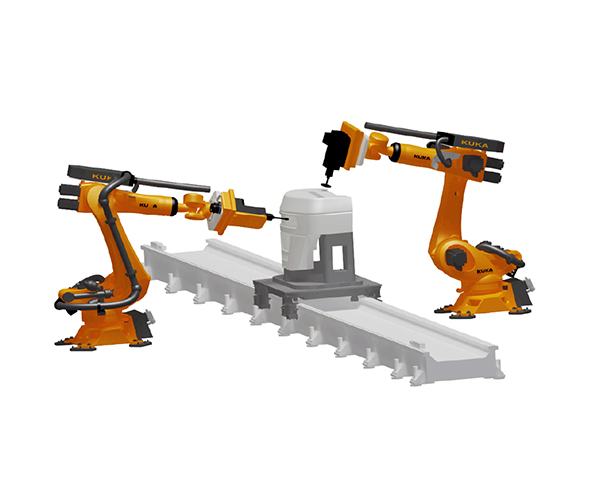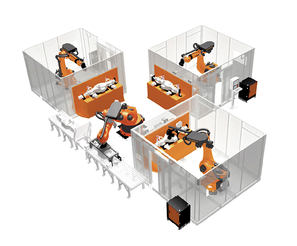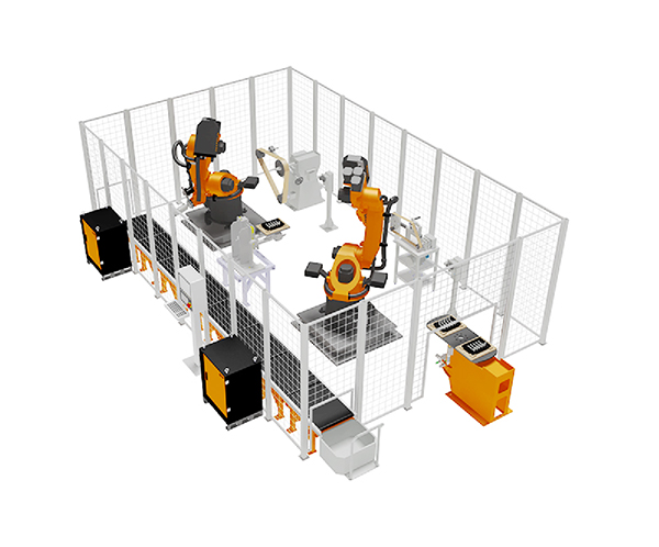 針對(duì)各類驅(qū)動(dòng)橋殼鑄件,利用機(jī)器人帶夾持工具對(duì)鑄件的澆冒口進(jìn)行切割和飛邊毛刺的打磨而專門設(shè)計(jì)的產(chǎn)品。該單元主要由4 臺(tái)機(jī)器人構(gòu)成,上下料機(jī)器人、切割機(jī)器人和打磨機(jī)器人,加工過程中,雙工位定位工作轉(zhuǎn)臺(tái)與工件上下料輸送輥道的協(xié)同,全自動(dòng)化完成橋殼的切割打磨過程,工件最大重量500kg。