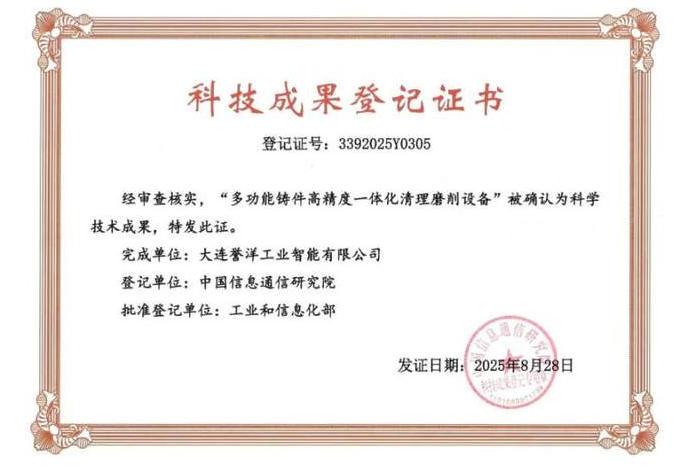 北京,2025年8月28日 —— 由大連譽洋工業智能有限公司自主研發的"多功能鑄件高精度一體化清理磨削設備"近日通過中科院院士團隊權威評定,正式被工業和信息化部登記為科學技術成果并獲頒證書。該項技術突破以高精度工藝創新為核心,有效解決了長期制約國內外高端復雜曲面鑄造磨削設備精密加工的卡脖子技術難題。 已在多家重點制造企業投入使用,獲得使用單位及主管部門的高度認可。 相關企業反饋顯示,設備在加工精度、運行效率和穩定性方面表現突出,完全滿足高端制造需求。